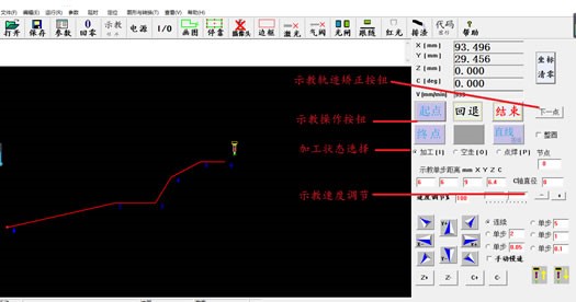 软件操作界面在“程序运行状态”和“示教编程状态”下都可操作,在工具栏上的“程序示教”切换两种状态。