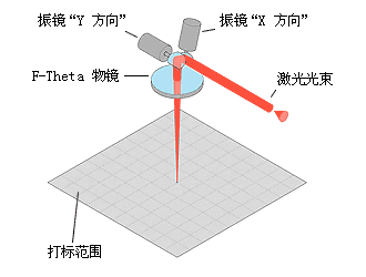 我们提供两轴激光扫描振镜/打标头,适用于各种不同的应用。两轴扫描振镜可以在X和Y方向上偏转激光束,产生一个二维区域,引导激光射向其中的任何位置。这个区域被称为打标范围,如图中所示。偏转是由两块镜片执行,其中每块由振镜电机移动。扫描振镜有一个光束输入端  ,激光束从此端输入,还有一个光束输出端,激光束偏转后从此端射出。